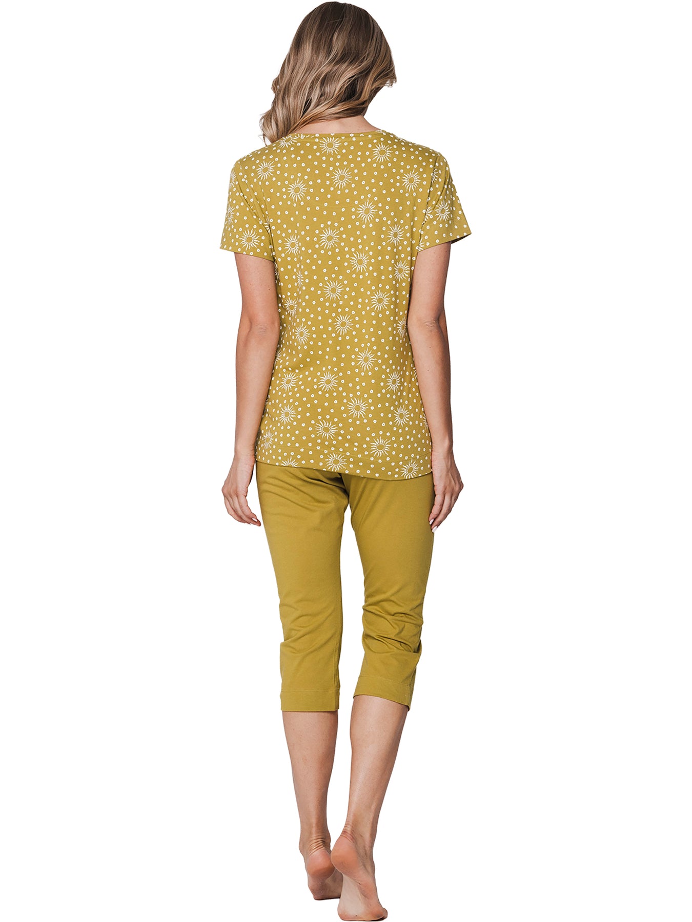 De top is uitgevoerd in een warme groentint met een speels zonnetjesdessin en heeft korte mouwen en een ronde hals met knoopsluiting. De driekwart broek is uni groen en voorzien van een comfortabele elastische tailleband voor een optimale pasvorm.